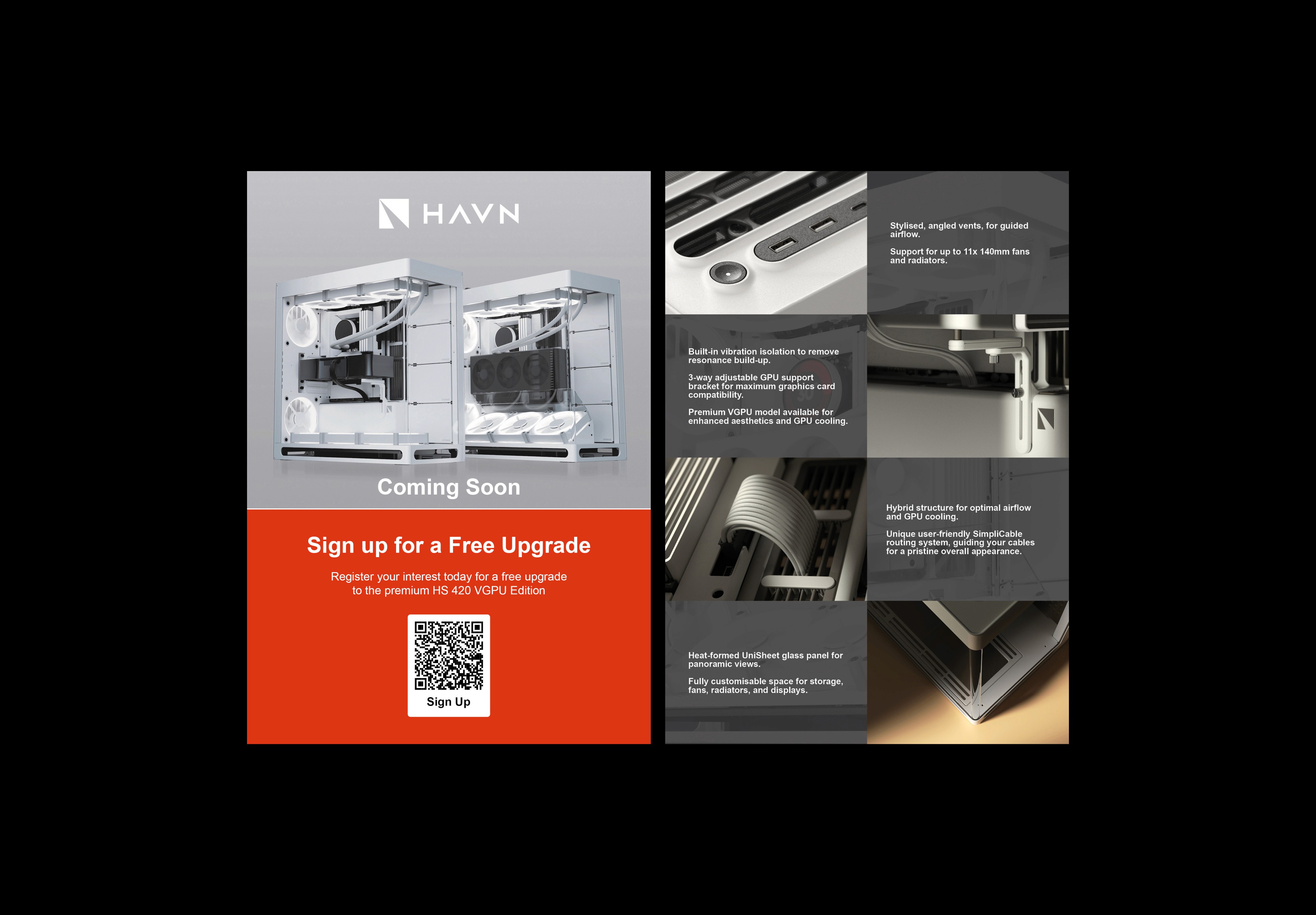 This project showcases HAVN, a premium PC case brand defined by minimalist form and precision engineering. The brand blends clean lines with a modern, architectural aesthetic, creating hardware that feels refined, functional, and intentionally crafted.